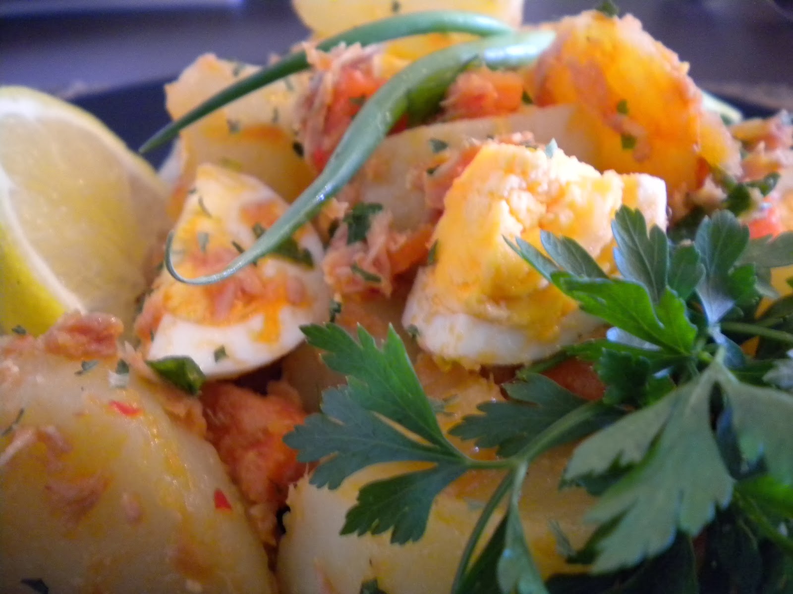 Awesome Tuna and Potato Salad, easy to make and can be a complete meal or as a side dish. When the Portuguese make this dish they use fresh tuna and infusion with the tastes of Portugal with olive oil and homemade pepper paste with hot crispy bread.